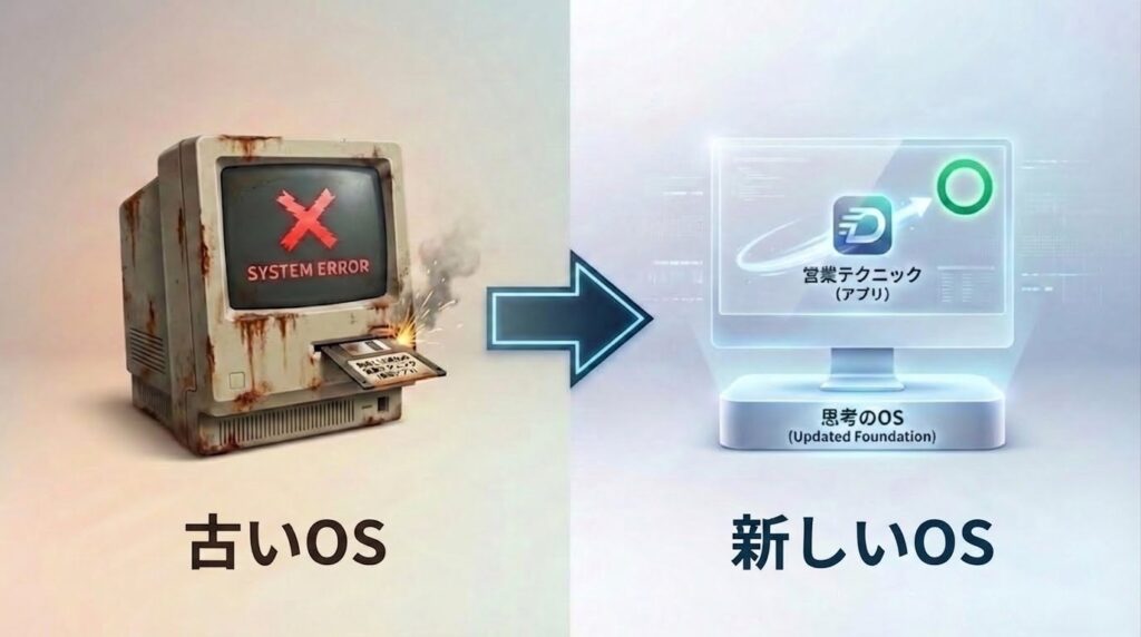 パソコンを想像してください。どれだけ最新の素晴らしいアプリケーション(営業ノウハウやトークスクリプト)を買ってきても、土台となるパソコンのOSが古ければ、エラーが起きて使いこなせませんよね。
